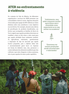 Em 2023, a SOF retomou a ATER pública com a chamada “Mulheres Rurais, Autonomia, Alimentação e Vidas Saudáveis”, envolvendo cerca de 300 agricultoras familiares e quilombolas do Vale do Ribeira, Sudoeste Paulista e outras regiões do estado. Nesse processo, emergiu uma preocupação comum: como lidar com as situações de violência vividas por muitas mulheres atendidas.