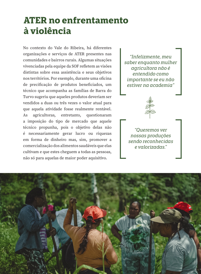 A elaboração deste material nasce de uma trajetória de quase 30 anos da SOF junto às mulheres agricultoras, em diálogo permanente com o Grupo de Trabalho de Mulheres da Articulação Nacional de Agroecologia (ANA) e a Marcha Mundial das Mulheres (MMM). Entre 2015 e 2017, a SOF realizou ATER agroecológica junto a 240 mulheres do Vale do Ribeira, em parceria com o Ministério do Desenvolvimento Agrário (MDA). A partir dessa experiência, formaram-se redes de organização coletiva, como a Rede Agroecológica de Mulheres Agricultoras (RAMA) e a União das Agricultoras Agroecológicas de Itaoca (UAAI), que seguem atuando de forma solidária e feminista em seus territórios.